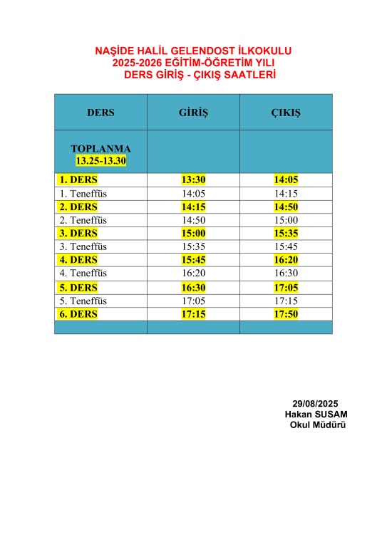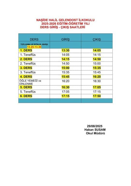 2025-2026 Eğitim Öğretim Yılı Ders Giriş Çıkış saatlerimiz.
